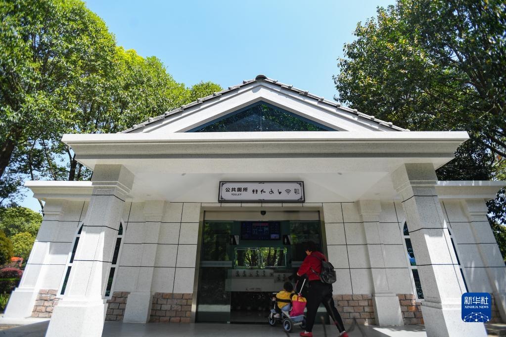 市民帶著小朋友進入位于湖南長沙縣星沙中心廣場的智慧廁所(2021年3月24日攝)。新華社記者陳澤國攝