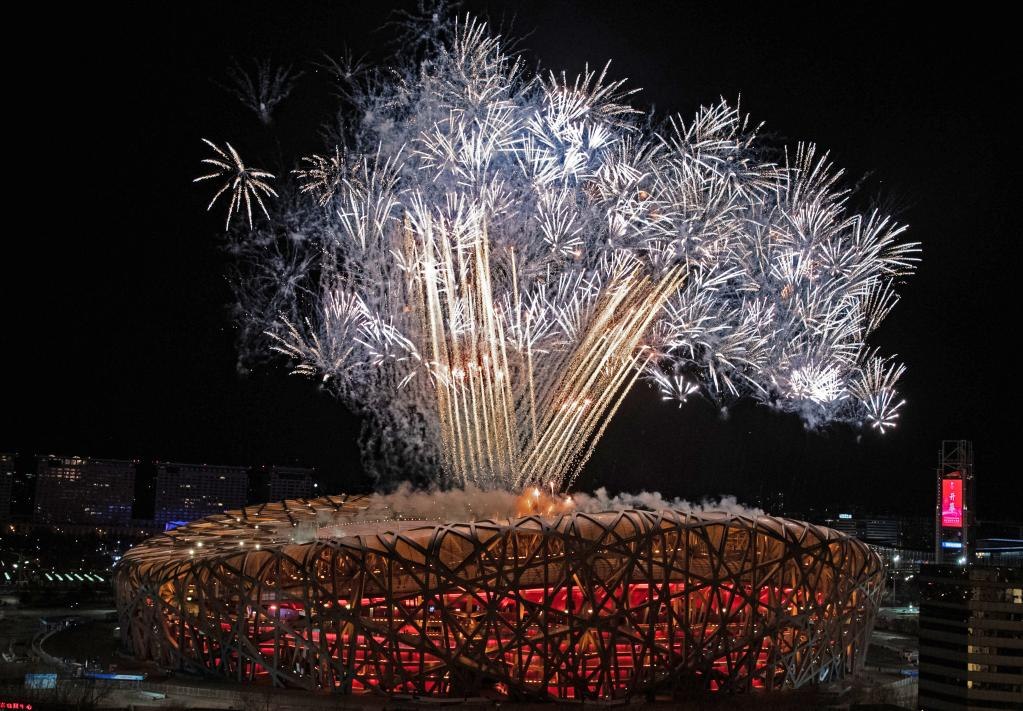 2月4日晚,第二十四屆冬季奧林匹克運動會開幕式在北京國家體育場舉行。圖為焰火表演。新華社記者鄔惠我攝