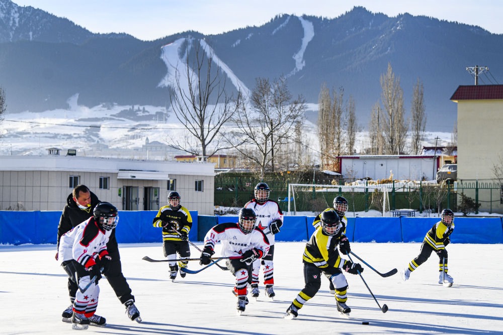 ↑新疆烏魯木齊市烏魯木齊縣第一中學(xué)小學(xué)部冰球隊的學(xué)生在進(jìn)行冰球比賽(2022年1月12日攝)。