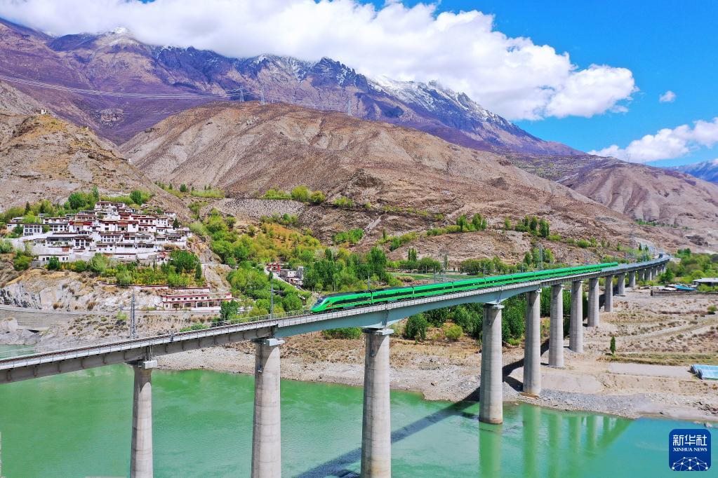復興號列車行駛在西藏朗縣境內(2022年4月14日攝)。新華社記者 覺果 攝