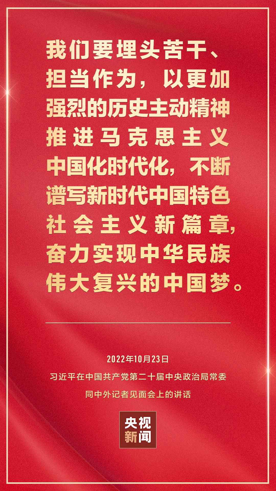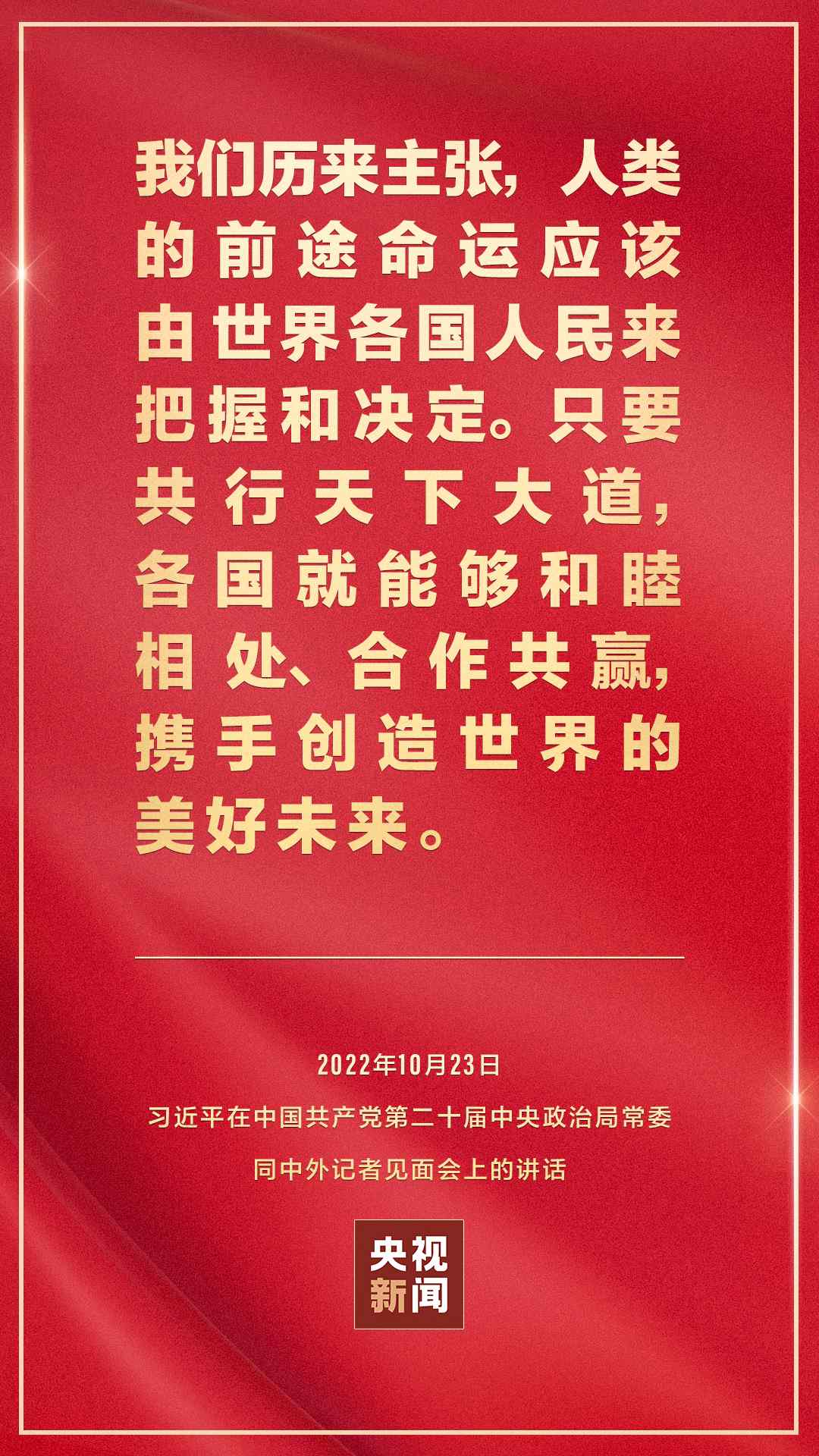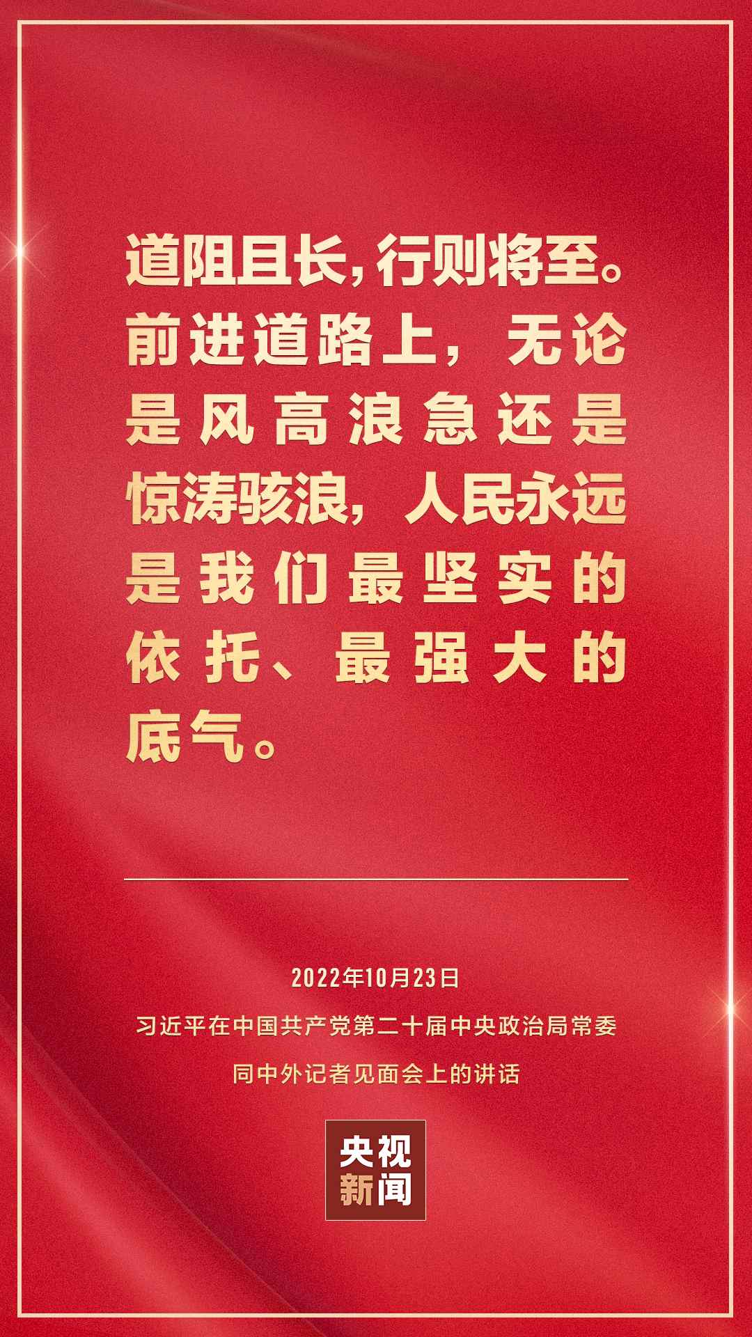 在中國共產(chǎn)黨第二十屆中央委員會第一次全體會議上當選的中共中央總書記習近平和中共中央政治局常委李強、趙樂際、王滬寧、蔡奇、丁薛祥、李希,23日中午在人民大會堂同采訪中共二十大的中外記者見面。習近平發(fā)表重要講話。