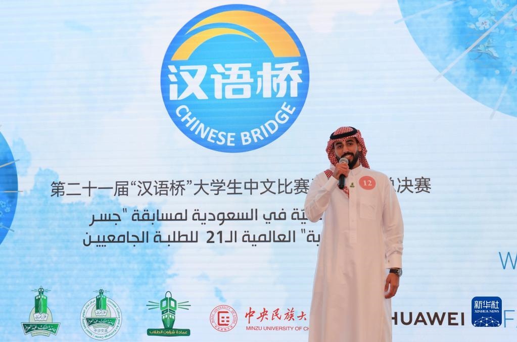 2022年7月20日,在沙特首都利雅得,第21屆“漢語橋”世界大學生中文比賽沙特賽區(qū)冠軍艾哈邁德·蘇萊曼在決賽中演講。新華社記者 王海洲 攝