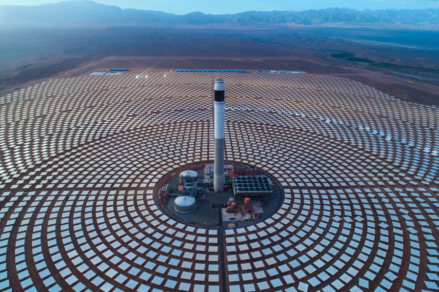 這是2018年6月7日在摩洛哥瓦爾扎扎特拍攝的努奧光熱電站項(xiàng)目三期工程(航拍照片)。從2015年起,中國電建集團(tuán)下屬的山東電建三公司在瓦爾扎扎特承建努奧光熱電站項(xiàng)目二期和三期工程。努奧光熱電站為超過百萬的摩洛哥家庭提供清潔能源。