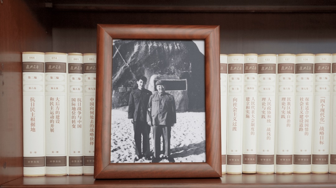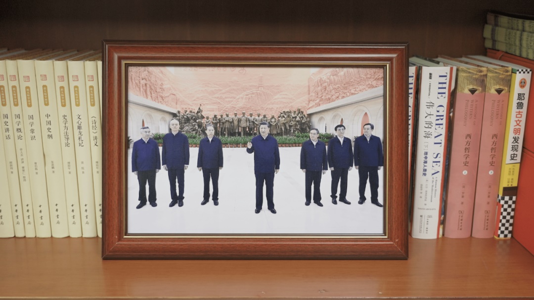 書架上擺放著一張合影。這是1999年9月30日,江澤民同志、朱镕基同志、習仲勛同志在慶祝建國五十周年招待會上。這張照片第一次出現(xiàn)在習近平總書記的書架上。