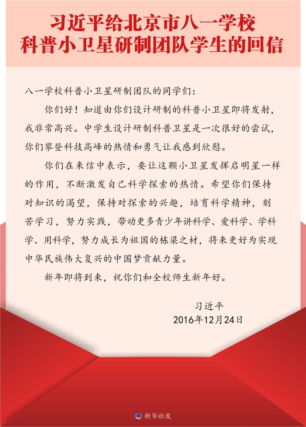 北京市八一學(xué)校是習(xí)近平總書記的母校。2016年底,八一學(xué)校的學(xué)生們給習(xí)近平總書記寫信,報告了他們參與設(shè)計研制的科普小衛(wèi)星即將發(fā)射的消息。很快,孩子們收到了總書記的回信。