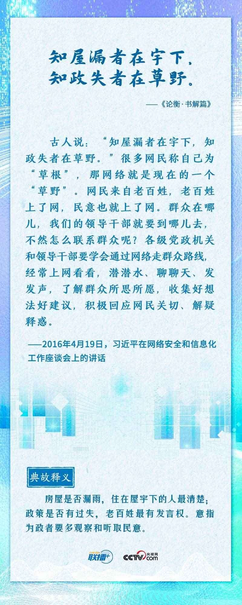 “知屋漏者在宇下,知政失者在草野”“日日行,不怕千萬里;常常做,不怕千萬事”......2016年4月19日,習近平總書記在網(wǎng)絡安全和信息化工作座談會上,從六個方面深刻回答了事關我國網(wǎng)信事業(yè)發(fā)展的一系列重大理論和實踐問題,并多次引經(jīng)據(jù)典加以闡述。