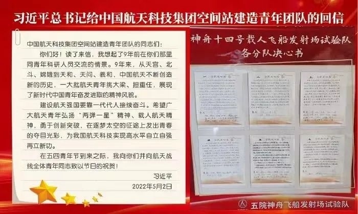 2022年5月2日,習近平總書記給中國航天科技集團空間站建造青年團隊回信,高度肯定航天青年,殷切期待青春奮斗。他強調:“希望廣大航天青年弘揚‘兩彈一星’精神、載人航天精神,勇于創(chuàng)新突破,在逐夢太空的征途上發(fā)出青春的奪目光彩,為我國航天科技實現高水平自立自強再立新功?!币荒陙?,五院人持續(xù)學習重溫、堅決貫徹落實習近平總書記重要回信精神和關于航天強國建設的重要指示批示精神,始終做到牢記囑托、感恩奮進,交出非凡“答卷”。