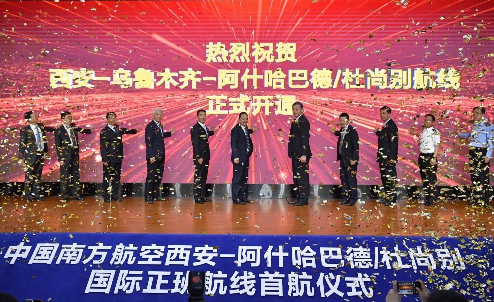 西安-阿什哈巴德/杜尚別國際正班航線首航儀式在西安舉行(5月13日攝)。新華社記者 邵瑞 攝