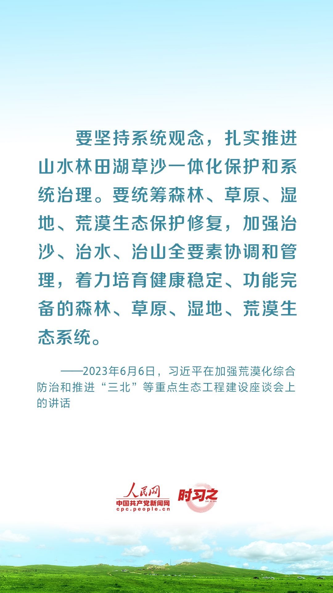 2023年6月5日至6日,中共中央總書(shū)記、國(guó)家主席、中央軍委主席習(xí)近平在內(nèi)蒙古自治區(qū)巴彥淖爾市考察,主持召開(kāi)加強(qiáng)荒漠化綜合防治和推進(jìn)“三北”等重點(diǎn)生態(tài)工程建設(shè)座談會(huì)并發(fā)表重要講話(huà)。座談會(huì)上,習(xí)近平對(duì)走好中國(guó)特色防沙治沙道路提出工作要求。