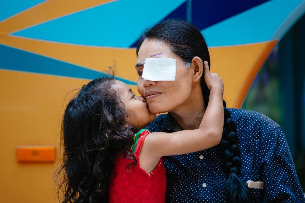 2019年3月15日,在柬埔寨磅湛省醫(yī)院,即將接受白內(nèi)障手術(shù)的患者孫美樂接受女兒的親吻祝福。在接受了中國(guó)醫(yī)療隊(duì)的白內(nèi)障義診手術(shù)后,她的視力逐步恢復(fù),生活有了新的光明和希望。