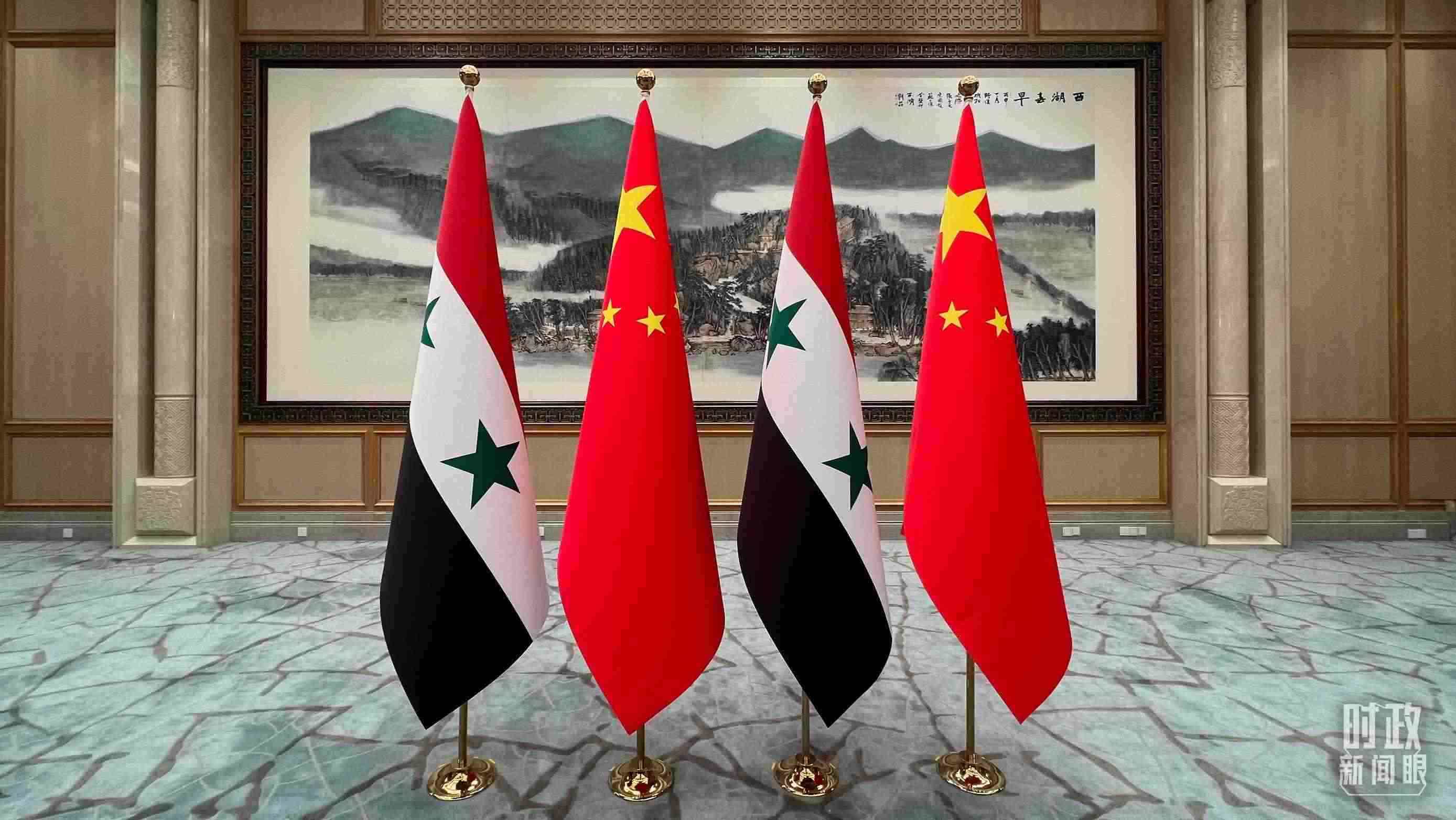 △會見現(xiàn)場擺放的中國、敘利亞國旗。(總臺央視記者程鋮拍攝)