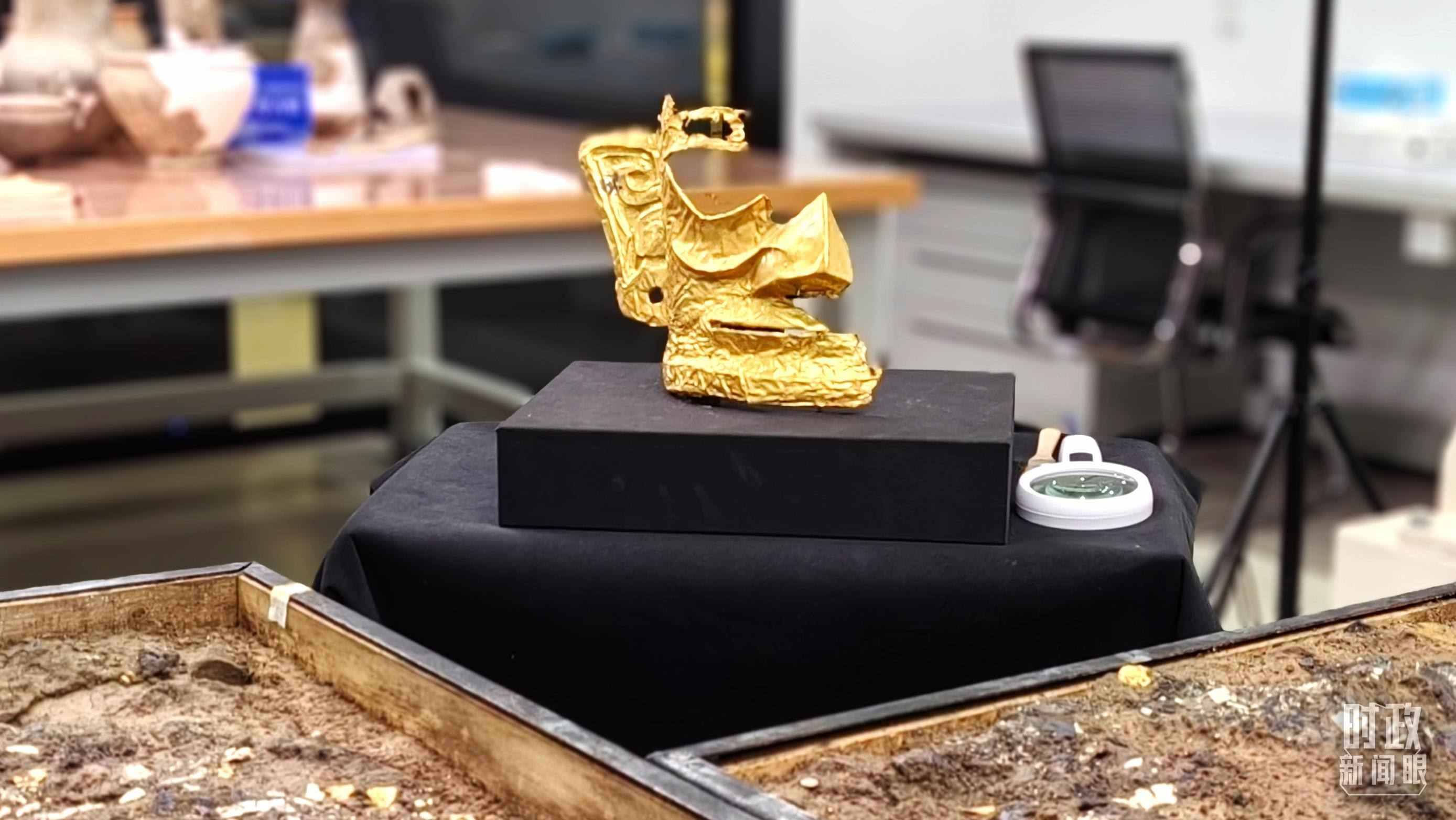 △文物保護(hù)修復(fù)展示中心內(nèi)正在修復(fù)的金面具。(總臺央視記者王萌萌拍攝)