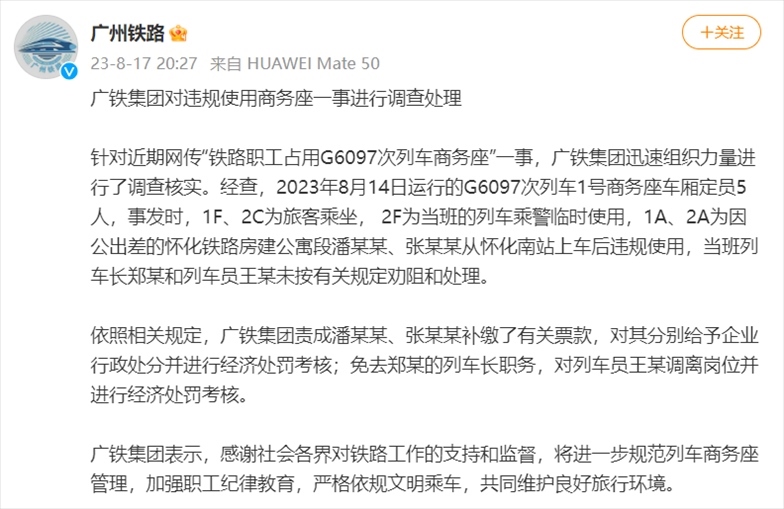 ·廣鐵集團(tuán)回應(yīng)職工占用高鐵商務(wù)座:2人補(bǔ)繳車票,列車長(zhǎng)免職。