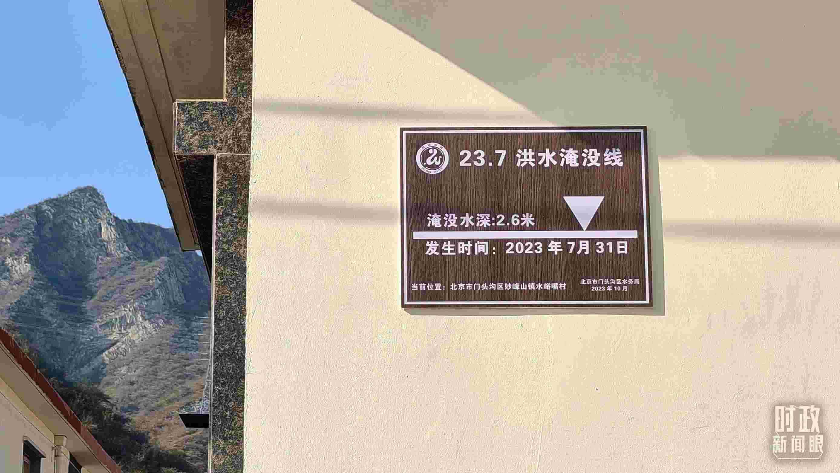 △ 村民房屋外設(shè)立了洪水淹沒線的標(biāo)牌。(總臺(tái)央視記者賈林拍攝)