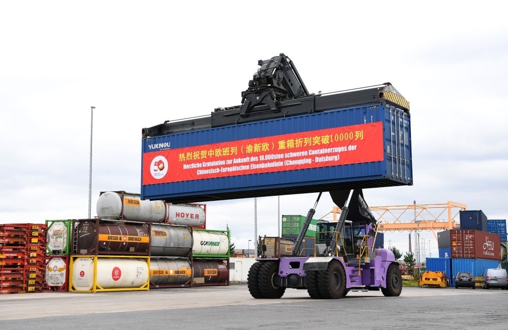 2022年7月11日,中歐班列(重慶)第10000列重箱折列抵達(dá)德國杜伊斯堡,這是接車儀式現(xiàn)場(chǎng)。