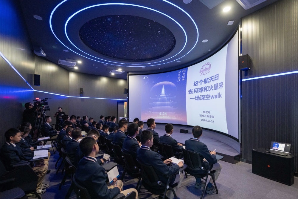 學生在哈爾濱工業(yè)大學航天館內(nèi)聽中國航天日主題講座(2024年4月24日攝)。新華社記者 謝劍飛 攝