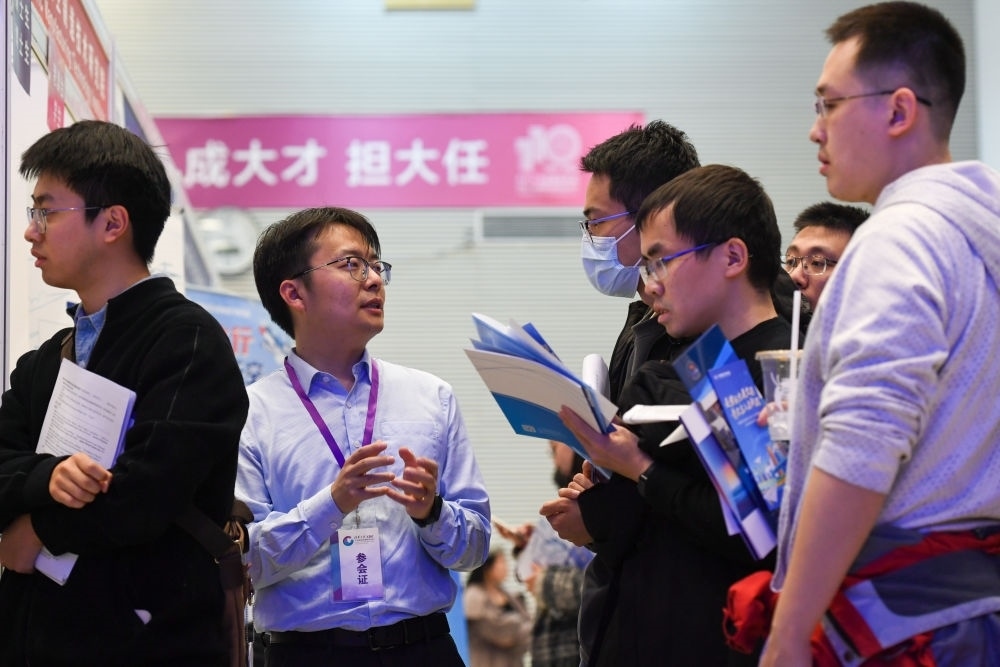 在清華大學舉辦的2024屆畢業(yè)生大型就業(yè)洽談會上,一名用人單位招聘人員(左二)與求職畢業(yè)生交流(2024年3月15日攝)。新華社記者 鞠煥宗 攝