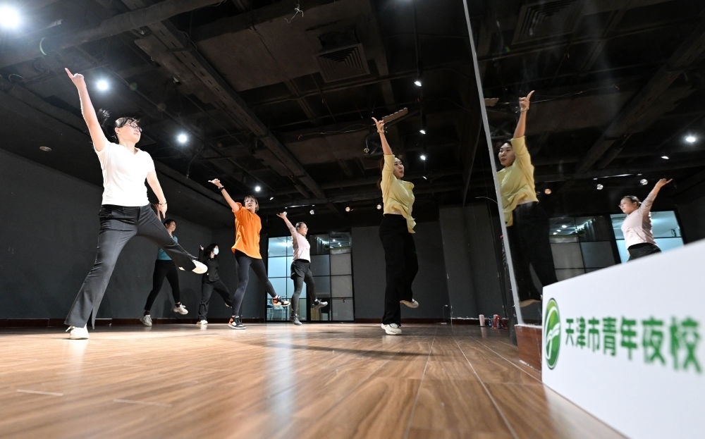 在天津青年宮,學員在青年夜校練習有氧健身舞(2024年4月23日攝)。新華社記者 趙子碩 攝
