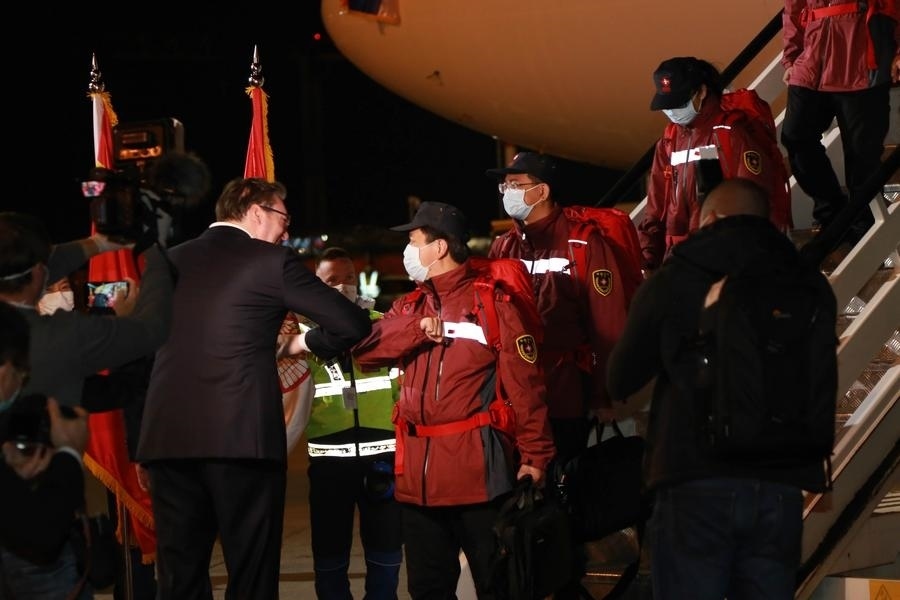 中國醫(yī)療團(tuán)隊(duì)在貝爾格萊德尼古拉·特斯拉機(jī)場降落時(shí)已是深夜。武契奇率領(lǐng)塞方多名高級(jí)官員到機(jī)場迎接。疫情期間不建議握手,于是這位塞爾維亞領(lǐng)導(dǎo)人選擇和中國專家團(tuán)成員一一碰肘以示尊重。對(duì)中國的及時(shí)支援心懷感激,他還在機(jī)場親吻了一面五星紅旗。