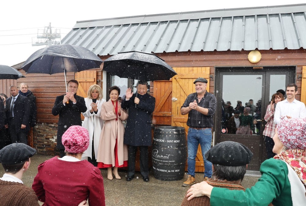 當地時間5月7日,應法國總統(tǒng)馬克龍?zhí)貏e邀請,國家主席習近平乘專機來到法國西南部上比利牛斯省訪問。在圖爾馬萊山口“牧羊人驛站”,習近平和夫人彭麗媛同馬克龍和夫人布麗吉特共同欣賞當地村民表演的具有濃郁南法風情的牧羊人之舞。新華社記者 姚大偉 攝