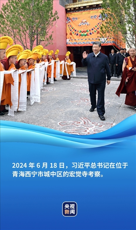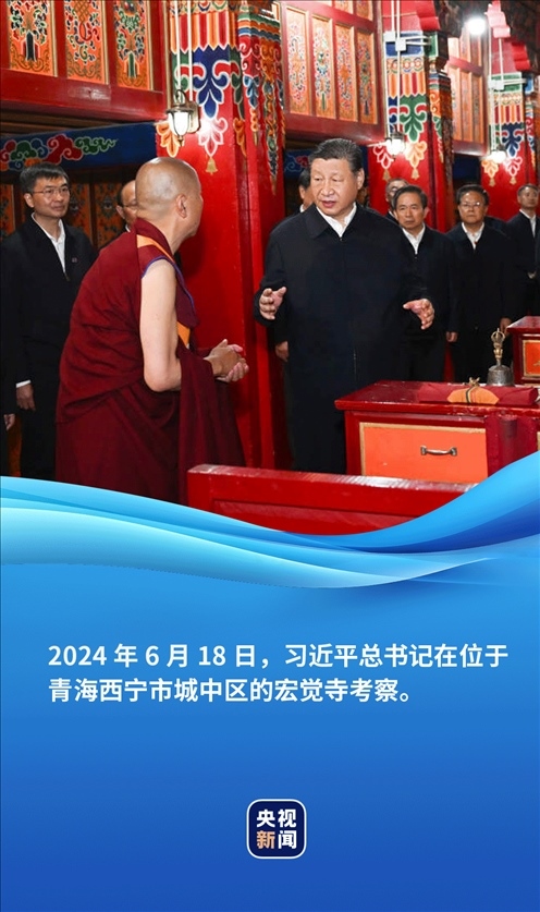 6月18日,正在青??疾斓牧暯娇倳泚淼轿挥谖鲗幨谐侵袇^(qū)的宏覺寺。在寺前院落,宏覺寺民主管理委員會負責人向總書記敬獻哈達,僧人提香爐、持寶傘迎接總書記。
