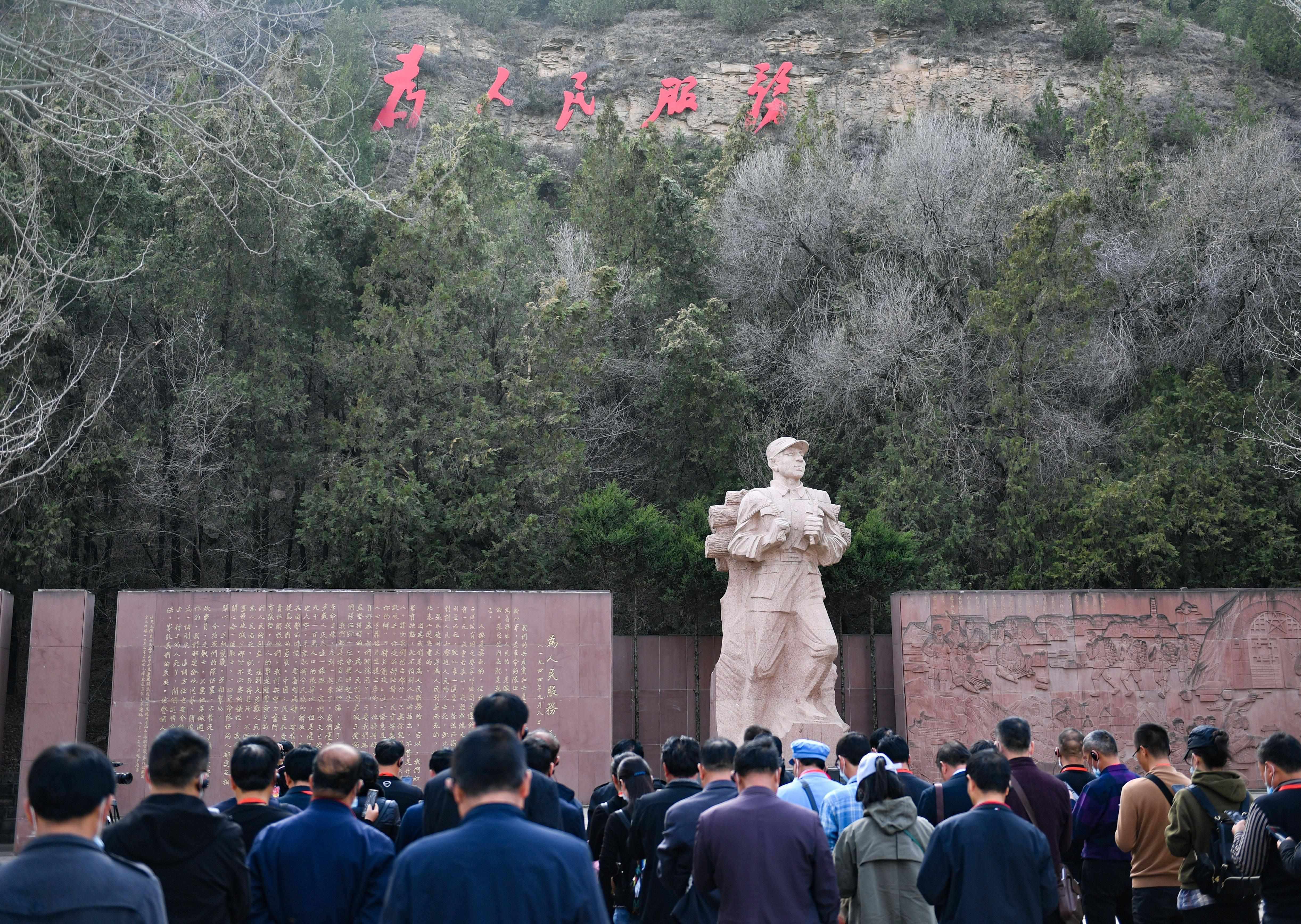 延安棗園,《為人民服務(wù)》講話紀(jì)念廣場,張思德負(fù)薪前行的雕像,巍然屹立,“為人民服務(wù)”5個鮮紅大字,熠熠生輝?!熬哂腥娜鉃橹袊嗣穹?wù)的精神”,在黨的七大上被寫進(jìn)黨章。
