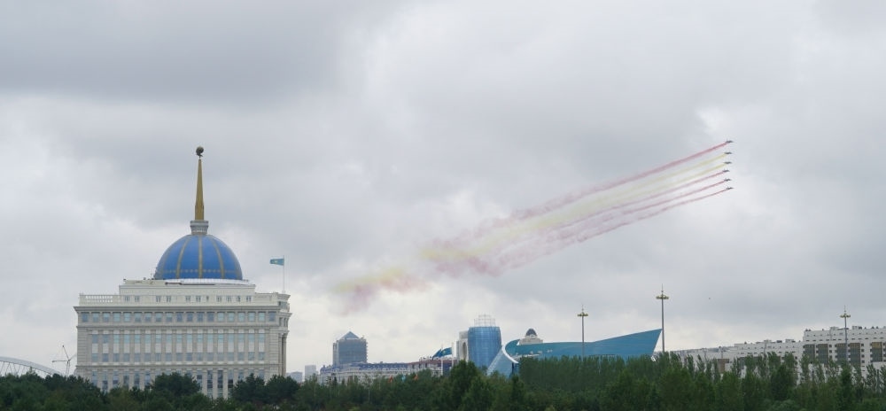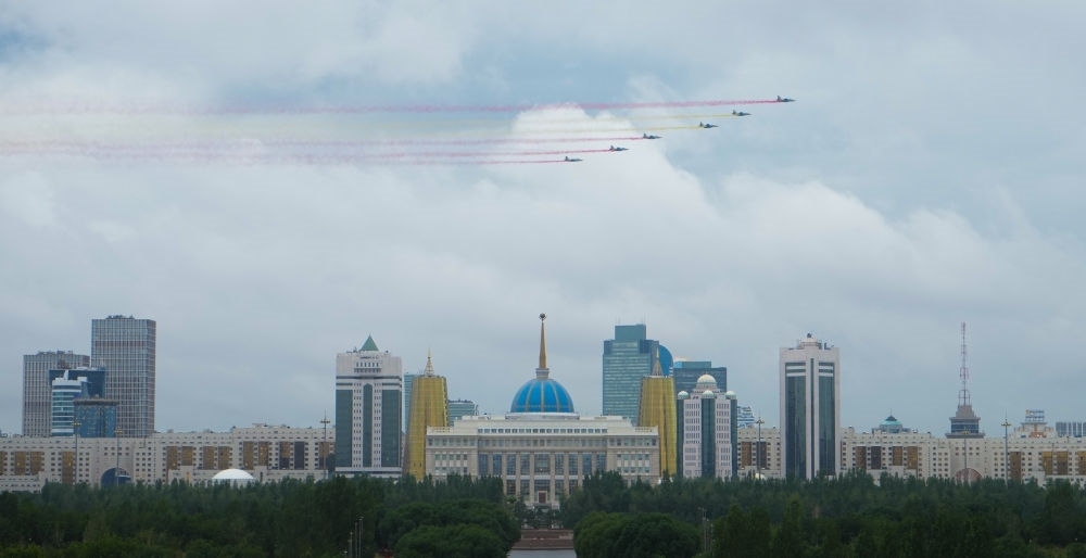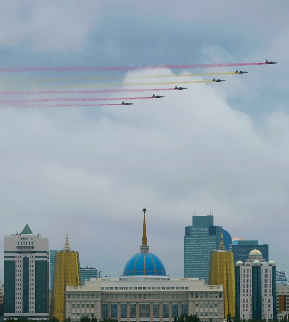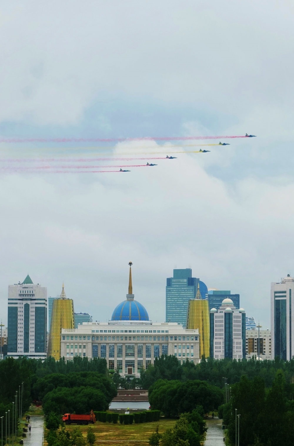 習(xí)近平主席抵達(dá)時,哈方多架戰(zhàn)機(jī)在總統(tǒng)府上空拉出中國國旗色彩煙歡迎中國貴賓。