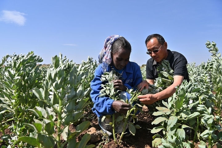 2023年9月27日,在位于厄立特里亞阿斯馬拉的農(nóng)業(yè)技術(shù)援助項目示范地,中國援厄第三期高級農(nóng)業(yè)專家組豆類作物專家劉運民(右)指導(dǎo)當(dāng)?shù)剞r(nóng)戶進(jìn)行蠶豆作物的田間管理。新華社記者 韓旭 攝