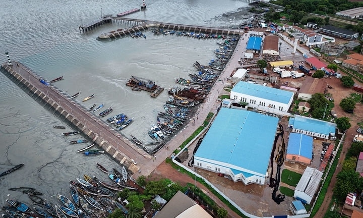 這是2024年7月8日在幾內(nèi)亞比紹首都比紹拍攝的板丁漁業(yè)碼頭和中企投建的水產(chǎn)品加工存儲綜合設(shè)施(右側(cè)藍(lán)頂建筑區(qū)域)(無人機照片)。新華社記者 韓旭 攝
