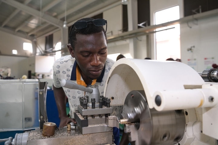 2023年1月10日,在加蓬首都利伯維爾的恩考克經(jīng)濟特區(qū),恩考克國際職業(yè)教育和培訓(xùn)中心(由中國航空技術(shù)國際控股有限公司聯(lián)合成都航空職業(yè)技術(shù)學(xué)院等院校共建)的學(xué)生進(jìn)行車削加工操作訓(xùn)練。新華社記者 韓旭 攝