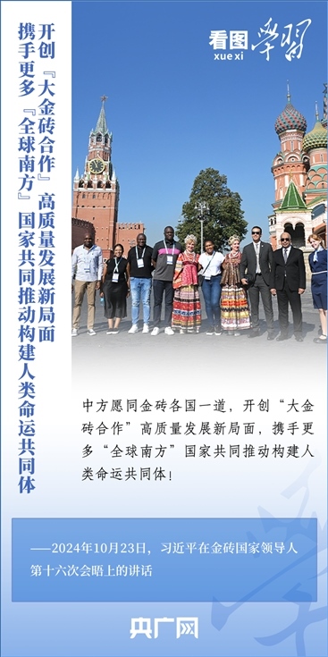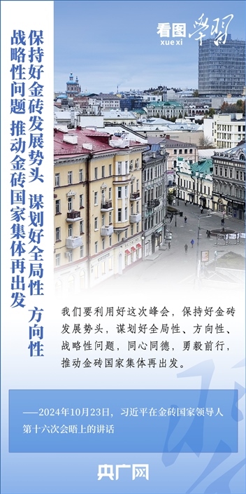 當(dāng)?shù)貢r間10月23日,國家主席習(xí)近平在俄羅斯喀山出席金磚國家領(lǐng)導(dǎo)人第十六次會晤并發(fā)表重要講話。習(xí)主席深刻闡述推動“大金磚合作”高質(zhì)量發(fā)展的中國主張,就金磚大家庭發(fā)展合作提出五點(diǎn)務(wù)實(shí)舉措,表達(dá)了中方愿同金磚各國一道,攜手更多“全球南方”國家共同推動構(gòu)建人類命運(yùn)共同體的真誠愿望。一起來學(xué)習(xí)!