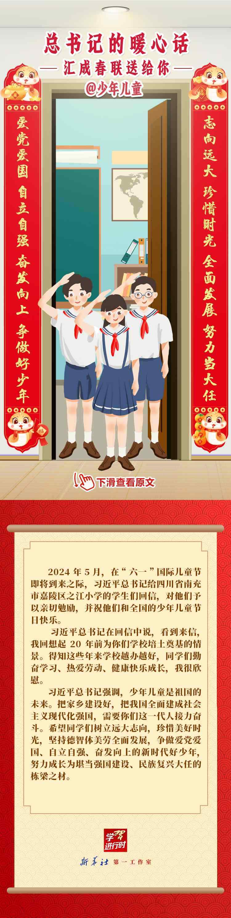 【學(xué)習(xí)進(jìn)行時(shí)】過(guò)春節(jié),貼春聯(lián),寄托人們對(duì)新年的美好愿望。過(guò)去一年,習(xí)近平總書(shū)記在不同場(chǎng)合點(diǎn)贊各行各業(yè)奮斗者,說(shuō)了許多暖心話。新春之際,我們匯編成聯(lián),向新征程上的每一位“主角”致敬,送上新春的祝福。