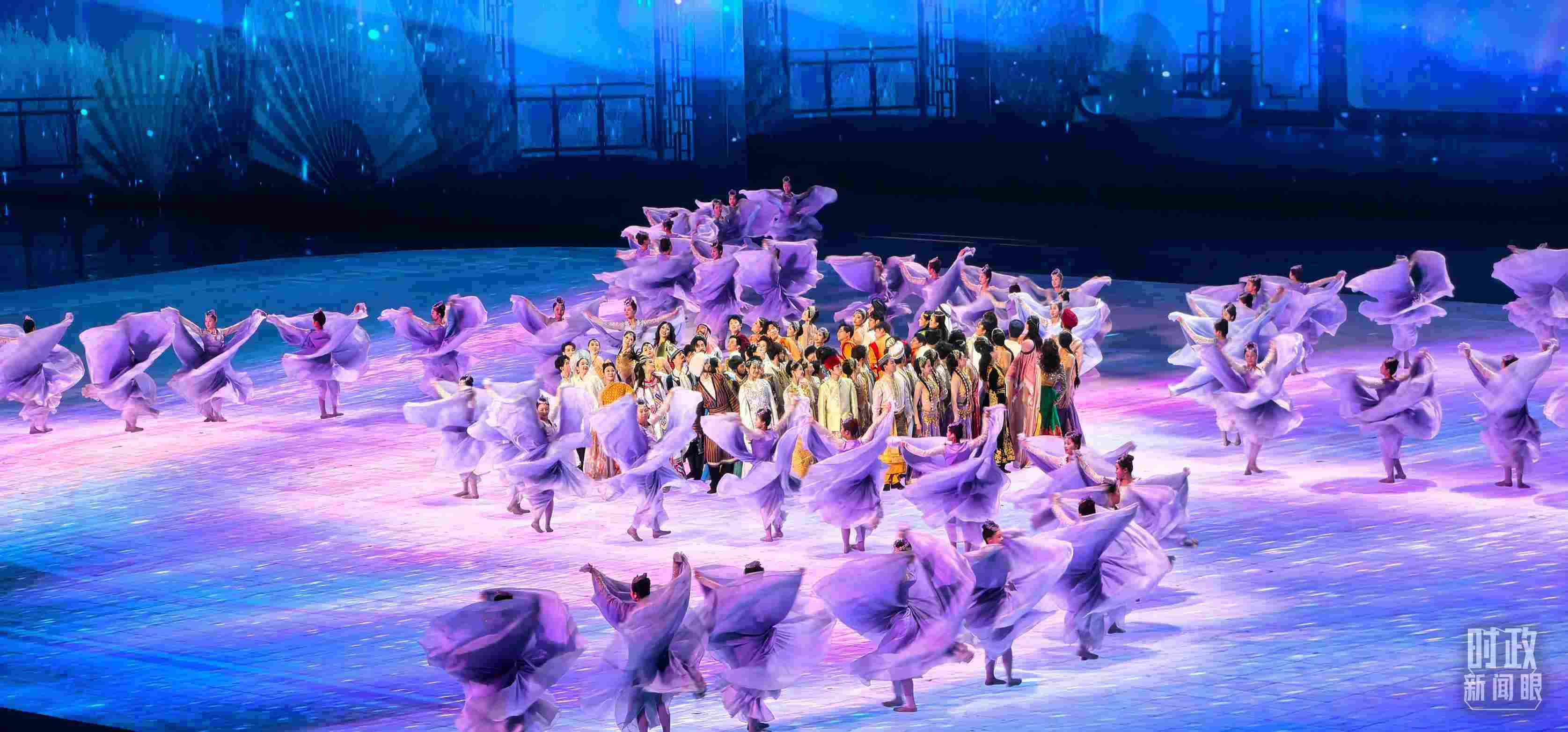 文藝表演分為上篇《熾熱冰雪》、中篇《燃情時速》、下篇《山高水長》,通過《長歌頌冰河》《榮光耀未來》《馳騁天地間》《璀璨嘉年華》《攜手情久長》《萬里共和鳴》等節(jié)目,展現(xiàn)化“極寒”為“極美”“極燃”“極暖”的意蘊。
