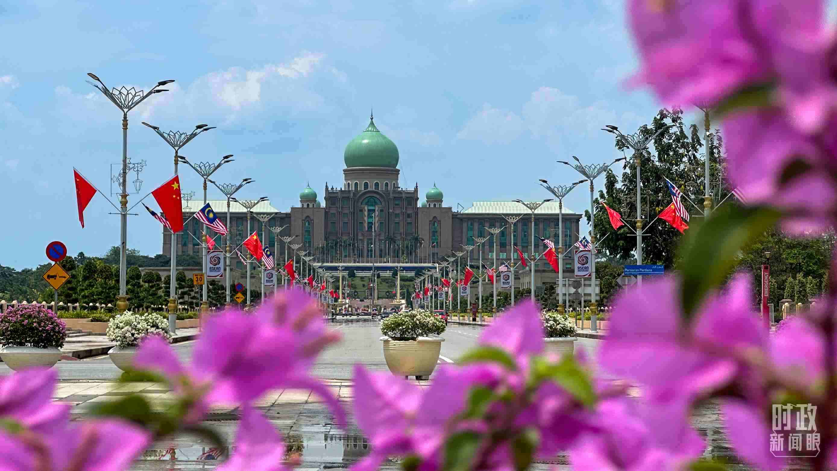 △馬來西亞總理府前懸掛的中馬兩國國旗。(總臺(tái)央視記者關(guān)舟拍攝)