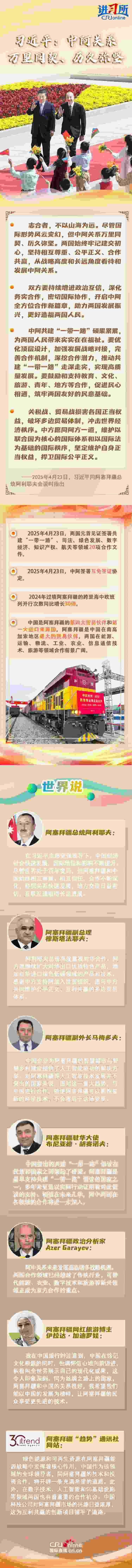 4月23日,中國(guó)國(guó)家主席習(xí)近平在北京同阿塞拜疆總統(tǒng)阿利耶夫舉行會(huì)談。兩國(guó)元首宣布,建立中阿全面戰(zhàn)略伙伴關(guān)系。習(xí)近平指出,盡管?chē)?guó)際形勢(shì)風(fēng)云變幻,但中阿關(guān)系萬(wàn)里同契、歷久彌堅(jiān)。雙方要持續(xù)增進(jìn)政治互信,深化務(wù)實(shí)合作,密切國(guó)際協(xié)作,開(kāi)啟中阿全方位合作新篇章,助力兩國(guó)發(fā)展振興,更好造福兩國(guó)人民。