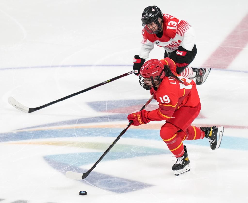 2月6日,中國隊(duì)球員張喜芳(右)在比賽中。新華社記者 孟永民 攝