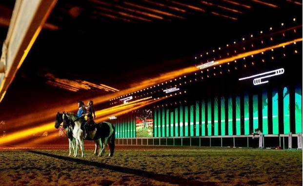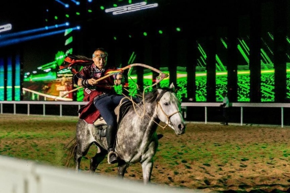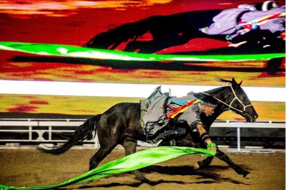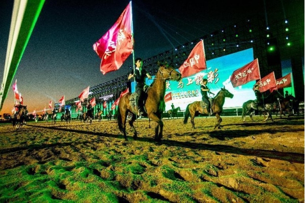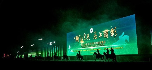 開幕式文體表演由《馬術(shù)方陣一馬當(dāng)先》、歌伴舞《我的城我的馬》、《名馬展示策馬揚(yáng)鞭》、《單馬技巧雙翼神馬》、《馬障礙秀躍馬揚(yáng)鞭》、《馬術(shù)秀人馬合一》、歌伴舞《騎跡包頭》、《無人機(jī)秀馬上精彩》八塊內(nèi)容組成。當(dāng)晚的賽汗塔拉馬術(shù)賽場流光溢彩、氣氛熱烈,場內(nèi)座無虛席、歡聲雷動。20時30分許,主騎手手持國旗,副騎手手持馬城旗幟,運(yùn)動員方陣、民族方陣、女騎方陣、馬主方陣入場,騎手們精神飽滿、英姿颯爽,不時揮手致意,現(xiàn)場觀眾用熱烈的掌聲和歡呼聲,歡迎他們的到來。達(dá)茂旗9歲賽馬冠軍阿茹樂手持彩旗引出世界名馬亮相,40對人馬合一的“千古馬頌”表演震撼全場,1000架無人機(jī)躍然天空,點(diǎn)亮“騎跡包頭 馬上精彩”的字樣……藍(lán)天、碧水、凈土的包頭在策馬奔騰的馬術(shù)競技中拉開了“中國馬城”的壯麗畫卷。