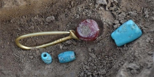 大坨頭文化聚落由內、外兩重環(huán)壕圍合,外環(huán)壕直徑142至155米,寬8至12米,圍合面積約1.7萬平方米。內環(huán)壕直徑70至72米,寬約18米,圍合面積約0.4萬平方米。在內環(huán)壕內、內外環(huán)壕之間均發(fā)現(xiàn)有灰坑、窖穴、房址等遺跡。環(huán)壕聚落外東南方向發(fā)現(xiàn)27座豎穴土坑墓葬,布局規(guī)律,墓葬方向一致,部分墓葬還出土了靴形足彩陶尊等彩繪陶器、玉玦、綠松石項鏈、紅瑪瑙串珠、扣針形帶翼喇叭口金耳環(huán)等隨葬品,顯示了墓主較高的地位等級。穩(wěn)定同位素結果顯示,新宮遺址人群的食性以粟為主,肉食水平略高于二里頭遺址人群,并且不同等級墓葬的墓主人之間飲食結構差異不大。該墓地的發(fā)現(xiàn),對于研究大坨頭文化的時空范圍、人群與族屬、喪葬習俗等提供了實物資料。