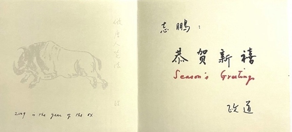 2009年為農(nóng)歷已丑年,俗稱牛年。李政道在賀年卡上畫(huà)了一頭健壯的牛。這頭牛騰起四蹄,犄角對(duì)著前方,勇猛無(wú)比。淡淡的筆墨,精準(zhǔn)的線條,黑白的布局,一頭開(kāi)山牛躍然紙上。牛尾的右上部,他用鉛筆輕輕寫(xiě)上了:“仿唐人筆法”。然后簽上了自己名字中的“政”字。