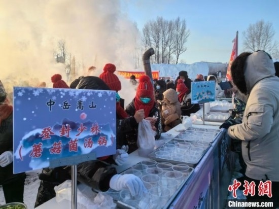 活動現(xiàn)場展示的寒地美食是一大亮點。熱氣騰騰的“登封少林”“泰安福祿”“華山論劍”等極具武俠味道的“江湖美食”讓參會者大飽口福,忘卻了-26℃的寒冷。