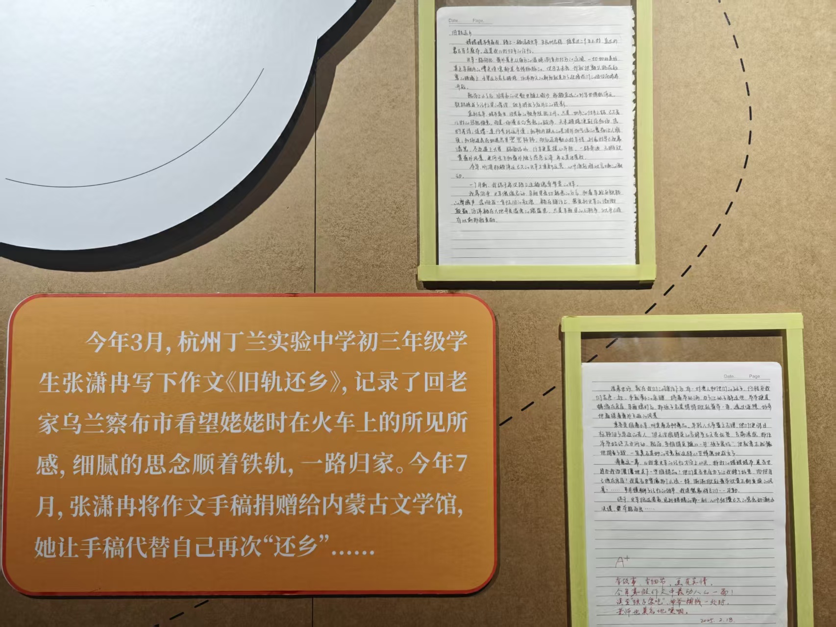 值得一提的是,憑借作文《舊軌還鄉(xiāng)》引起網友廣泛關注和共鳴的內蒙古籍女孩張瀟冉,今年7月將手稿捐贈給了內蒙古文學館,本次展覽對《舊軌還鄉(xiāng)》手稿進行展出。展覽還展出了生于2007年的少女詩人姜二嫚的詩作,年少成名的姜二嫚用7歲時所作的《光》向全國小詩人們送上問候。