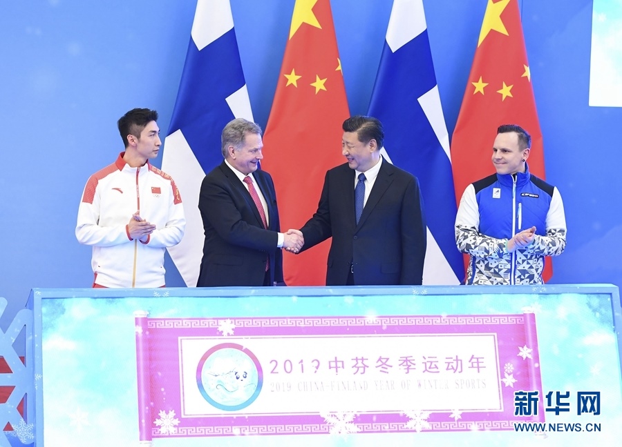 簽字儀式后,習(xí)近平同尼尼斯托共同出席了“2019中芬冬季運(yùn)動年”啟動儀式。習(xí)近平在致辭中指出,新中國第一次走上奧運(yùn)賽場就是參加1952年芬蘭赫爾辛基奧運(yùn)會,五星紅旗第一次在奧林匹克體育場上升起。中芬冬季運(yùn)動發(fā)展契合度高、互補(bǔ)性強(qiáng),合作潛力巨大。相信“2019中芬冬季運(yùn)動年”將推動兩國體育合作邁上新臺階,共同為中芬人文交流注入新活力,不斷推動中芬面向未來的新型合作伙伴關(guān)系邁上新臺階。尼尼斯托表示,中國已成為世界體育大國。芬中在體育領(lǐng)域結(jié)緣已久。芬蘭支持中國成功舉辦2022年冬奧會,很高興成為第一個同中國開啟冬季運(yùn)動年的國家,相信這將進(jìn)一步促進(jìn)兩國人民的友誼。中國正在向冬季運(yùn)動強(qiáng)國邁進(jìn),芬蘭愿助一臂之力。