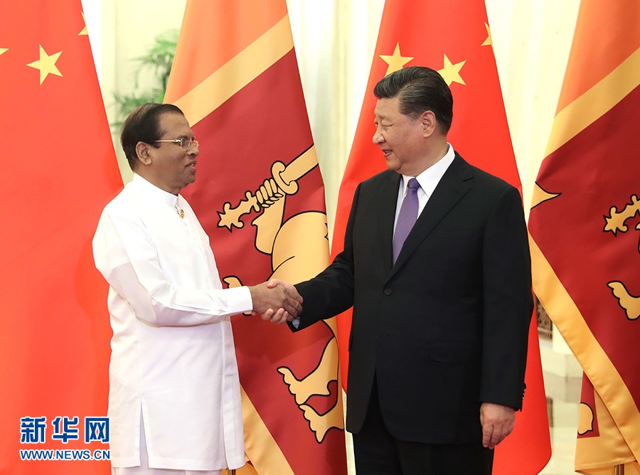 5月14日,國家主席習(xí)近平在北京人民大會堂會見來華出席亞洲文明對話大會的斯里蘭卡總統(tǒng)西里塞納。 新華社記者 姚大偉 攝