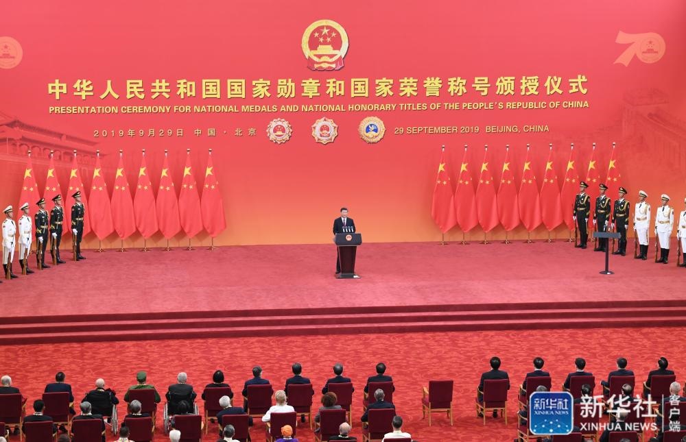 ↑9月29日,中華人民共和國國家勛章和國家榮譽稱號頒授儀式在北京人民大會堂金色大廳隆重舉行。中共中央總書記、國家主席、中央軍委主席習近平向國家勛章和國家榮譽稱號獲得者頒授勛章獎章并發(fā)表重要講話。新華社記者黃敬文攝