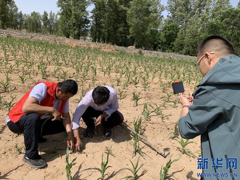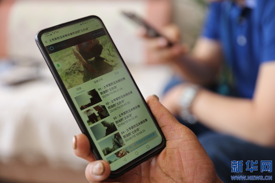 6月10日,內(nèi)蒙古自治區(qū)烏審旗無定河鎮(zhèn)農(nóng)業(yè)“土專家”在玉米地里針對小地老虎病蟲害問題,進行線上直播,向當?shù)剞r(nóng)民講解防治方法。新華網(wǎng)曹楨攝