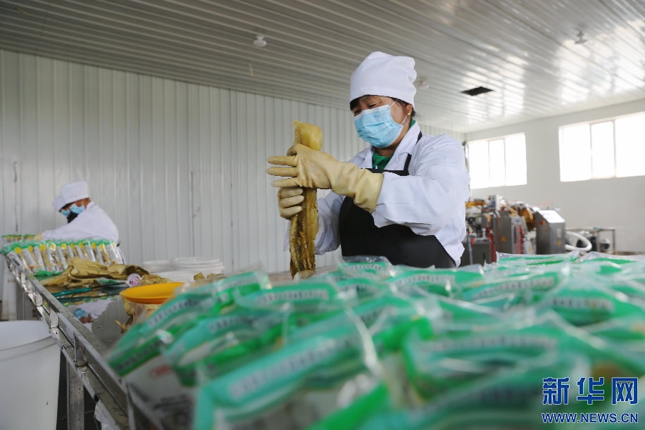 6月11日,內(nèi)蒙古自治區(qū)杭錦旗中圖村農(nóng)民米蘭在當?shù)胤N植合作社醬腌菜生產(chǎn)加工廠工作。新華網(wǎng)曹楨攝