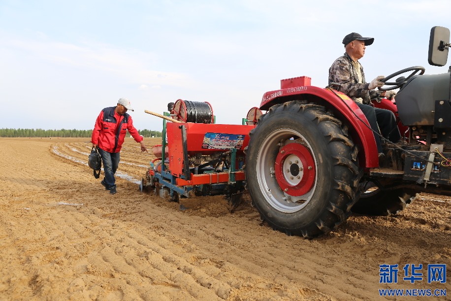 6月12日,內(nèi)蒙古自治區(qū)達拉特旗天義昌村村民趙培小(左)在地里播種葵花。新華網(wǎng)曹楨攝