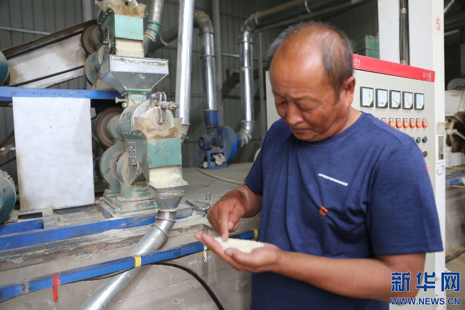6月12日,內(nèi)蒙古自治區(qū)達拉特旗沙圪堵村農(nóng)民李清云在廠房里查看稻米加工情況。新華網(wǎng)曹楨攝