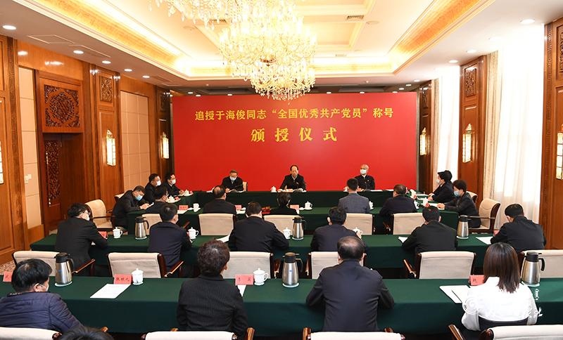 12月23日,受中央組織部委托,自治區(qū)黨委在呼和浩特舉行追授于??⊥尽叭珖?guó)優(yōu)秀共產(chǎn)黨員”稱號(hào)頒授儀式。自治區(qū)黨委書記、人大常委會(huì)主任石泰峰向于??⊥炯覍兕C授獎(jiǎng)?wù)伦C書并講話,號(hào)召全區(qū)廣大黨員干部深入學(xué)習(xí)于??⊥鞠冗M(jìn)事跡,以英雄為鏡、向模范對(duì)標(biāo),在本職崗位上展現(xiàn)共產(chǎn)黨人應(yīng)有的責(zé)任擔(dān)當(dāng),為推動(dòng)現(xiàn)代化內(nèi)蒙古建設(shè)作出更大貢獻(xiàn)。自治區(qū)黨委常委、組織部部長(zhǎng)楊偉東主持頒授儀式,并宣讀《中共中央關(guān)于授予周永開、張桂梅同志和追授于???、李夏、盧永根、張小娟、加思來提·麻合蘇提同志“全國(guó)優(yōu)秀共產(chǎn)黨員”稱號(hào)的決定》。自治區(qū)黨委常委、秘書長(zhǎng)、自治區(qū)常務(wù)副主席張韶春出席。于??⊥炯覍賱⑽膽c,內(nèi)蒙古森工集團(tuán)黨委書記、董事長(zhǎng)陳佰山,根河林業(yè)局防火管理處森防大隊(duì)副大隊(duì)長(zhǎng)范紀(jì)東分別發(fā)言,他們以親身經(jīng)歷和切身感受,滿懷深情地追述了于海俊同志的先進(jìn)事跡和感人故事。