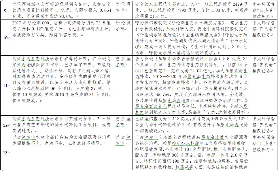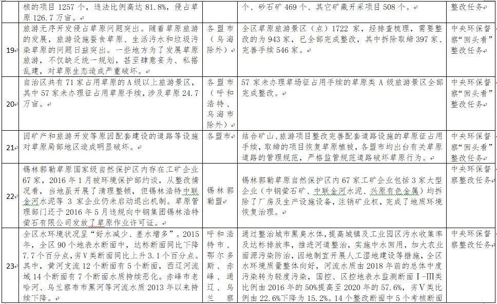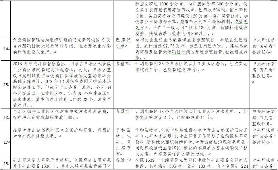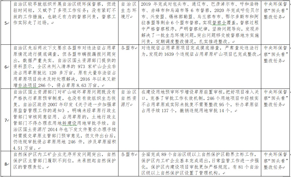 中央環(huán)境保護督察以來,自治區(qū)各級黨委政府及相關(guān)部門高度重視反饋意見整改工作,貫徹落實習(xí)近平生態(tài)文明思想的自覺性和主動性顯著增強,采取強有力措施積極推動整改工作,整改工作取得階段性成果。近期部分整改任務(wù)已通過自治區(qū)相關(guān)委辦廳局驗收,現(xiàn)予以公示,公示期2021年2月5日至2月9日,未提出異議的整改任務(wù)給予銷號(聯(lián)系電話:0471-4632171)。
